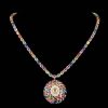 Dây chuyền nữ thanh lịch này được chế tác bằng Vàng trắng 14k và đá Sapphire thiên nhiên 100% có trọng lượng 2.50 carat được khai thác từ Ceylon, Sri Lanka + với 72 viên Kim cương lấp lánh, tổng cộng 1.45 carats và 102 viên đá Sapphire , tổng cộng 57.50 carats.