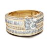With fascinating brilliance and a commanding presence, this shimmering ring set is all she ever dreamed of. It features a princess cut stone at the center, while additional princess and round cut stones adorn the shank. On your special day, a coordinating band completes this unique and intriguing ensemble. She’ll know just how much she means to you with this glittering ring set on her finger.