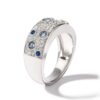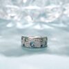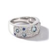Add some fun to your everyday style with this band. Delicate and sparkling, this band will draw your eyes at first sight. Crafted in sterling silver, this band features four round light-blue stones and five deep-blue round stones irregularly distributed on the band. The shank is paved with smaller white round stones, showing a sparkling look from every angle. Celebrate your anniversary together with this chic band or treat yourself a holiday gift with this little lovely piece.