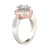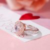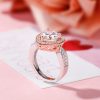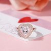 Express all the love you hold in your heart with this exquisite ring. the engagement ring showcases a magnificent heart-shaped center stone. A rose tone halo frame of smaller round stones wraps this center stone in a sparkling embrace, while additional stones line the ring’s shank. On that special day, when you ask for her hand in marriage, honor her with this exquisite ring.