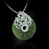 Mặt dây đá Cẩm thạch được thiết kế đặc biệt như tấm bùa hộ mạng, may mắn, cầu bình an, tránh tai ách. Các họa tiết đính xoàn được tiết chế có thể xoay 360 độ nhằm tôn lên viên Cẩm thạch chính là điểm nổi bật của sản phẩm này.