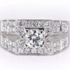 A square geometric and solid ring with a wider width. This ring is completely grain set for an all diamond look and featuring a larger soliatire diamond in the centre. A pinch opening runs through the sides of the ring to add sophistication and balance to the piece.