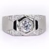A claw set centre diamond mens ring with hexagon border. A light trim of pave set diamonds combined with a matte finish side panel.