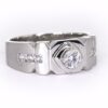 A mens band set with a sollitaire centre and light ripples along the band. Band has a satin finish and thin channel streak of channel set diamonds for contrast.